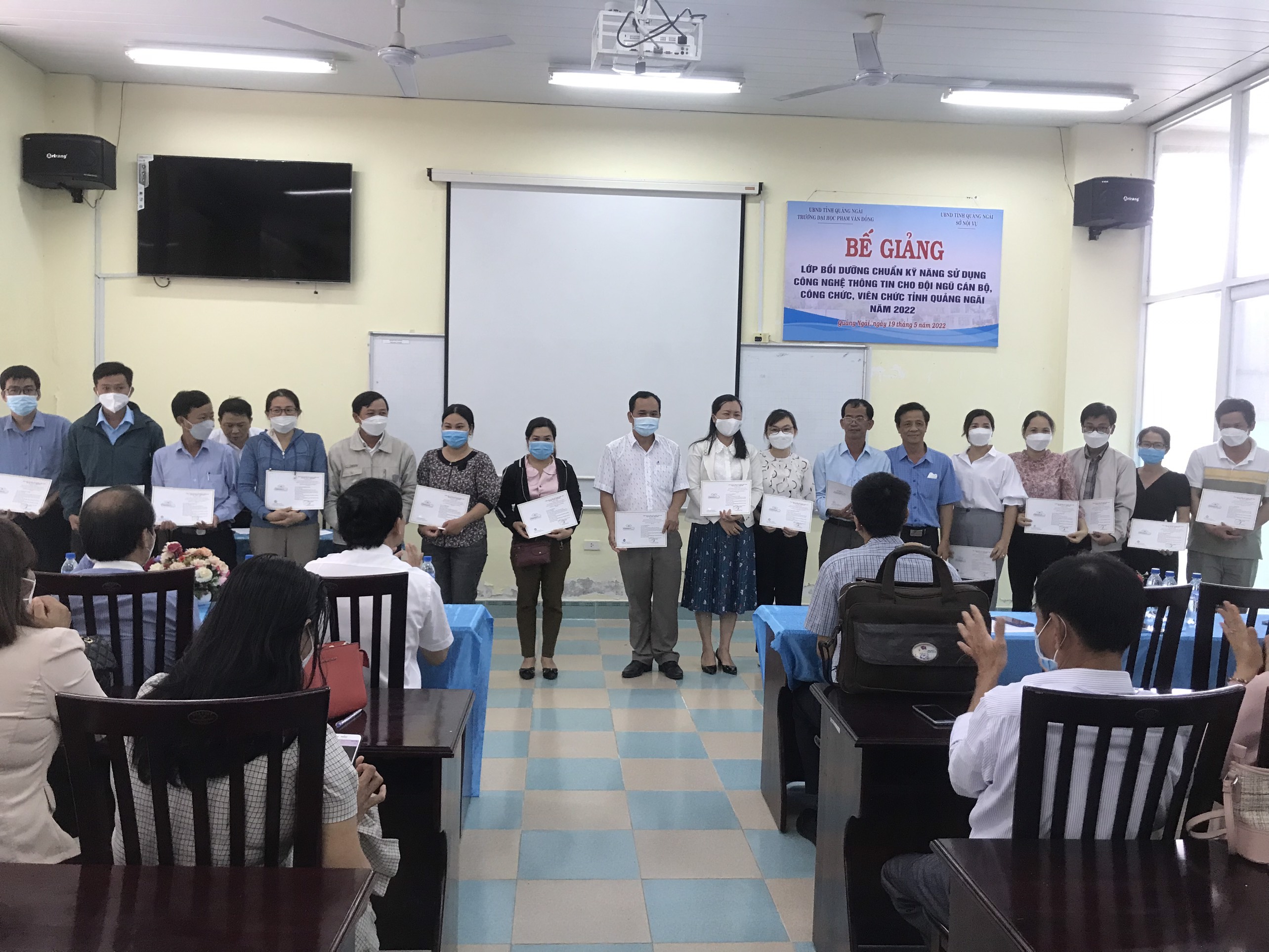 Chiều nay 19/5/2022, Trường Đại học Phạm Văn Đồng tổ chức Bế giảng Khóa bồi dưỡng chuẩn kỹ năng sử dụng Công nghệ thông tin cho đội ngũ cán bộ, công chức, viên chức tỉnh Quảng Ngãi, năm 2022. Khóa bồi dưỡng có tổng số 211 học viên tham dự là cán bộ, công chức, viên chức các sở, ngành, đơn vị, huyện, thị xã, thành phố của tỉnh Quảng Ngãi. Kết thúc khóa học, các học viên được Trường Đại học Phạm Văn Đồng công nhận, cấp và trao Chứng nhận hoàn thành Chương trình Bồi dưỡng chuẩn kỹ năng sử dụng Công nghệ thông tin cho đội ngũ cán bộ, công chức, viên chức năm 2022.